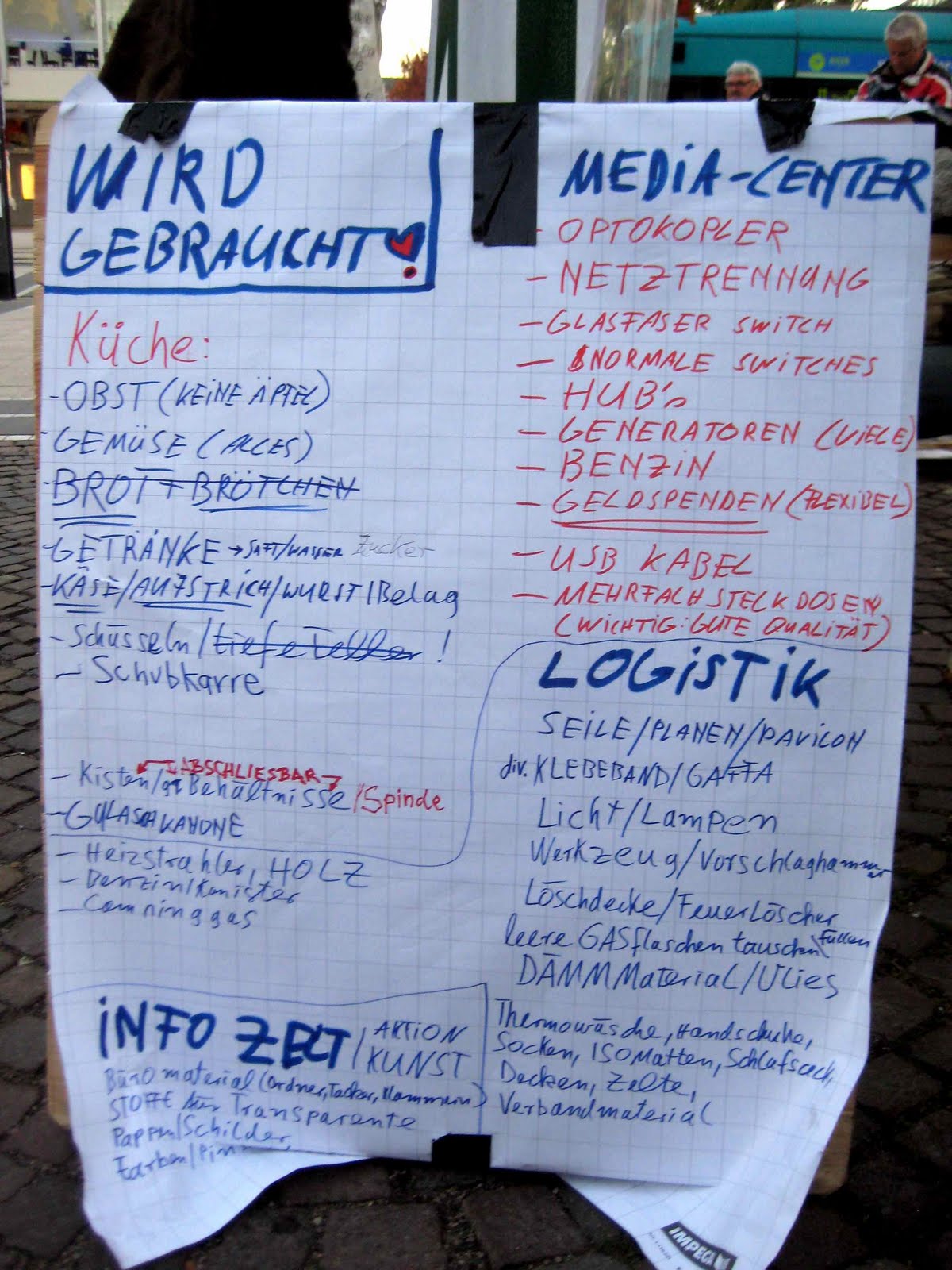 So sieht der momentane Sachspendenbedarf bei #occupyfrankfurt aus, Stand heute 17 Uhr. Wir freuen uns riesig über alles, was vorbeigebracht wird. Über "flexible" Geldspenden freuen wir uns natürlich auch, siehe der dezente Einschub unter 'Media-Center'.